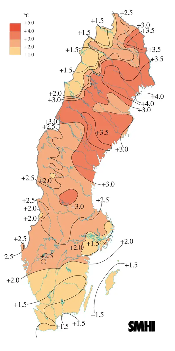Vintern har varit övervägande mild i hela landet frånsett en ordentlig köldknäpp i slutet av januari och början av februari. Sammantaget har därför vintern varit betydligt mildare än normalt, från drygt 1º varmare längst nere i söder till över 3º varmare i landets nordostligaste delar.