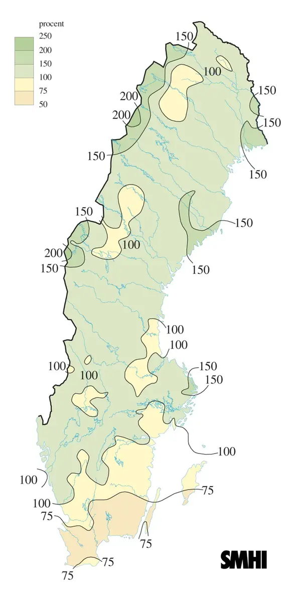 Nederbördsmässigt upplevde de centrala delarna av Norrlands fjälltrakter och anslutande inland samt södra och östra Götaland en betydligt torrare majmånad än normalt.