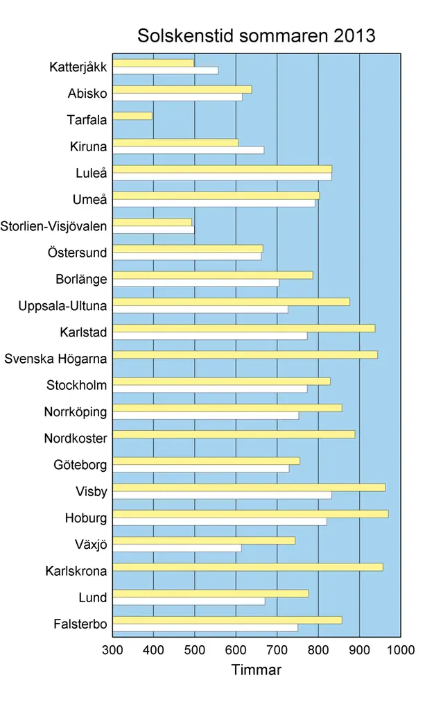 Förstora bildenAntal soltimmar under sommaren 2013 (gula staplar) jämfört med det normala (vita staplar). Normalvärden saknas för några stationer med kort mätserie.
