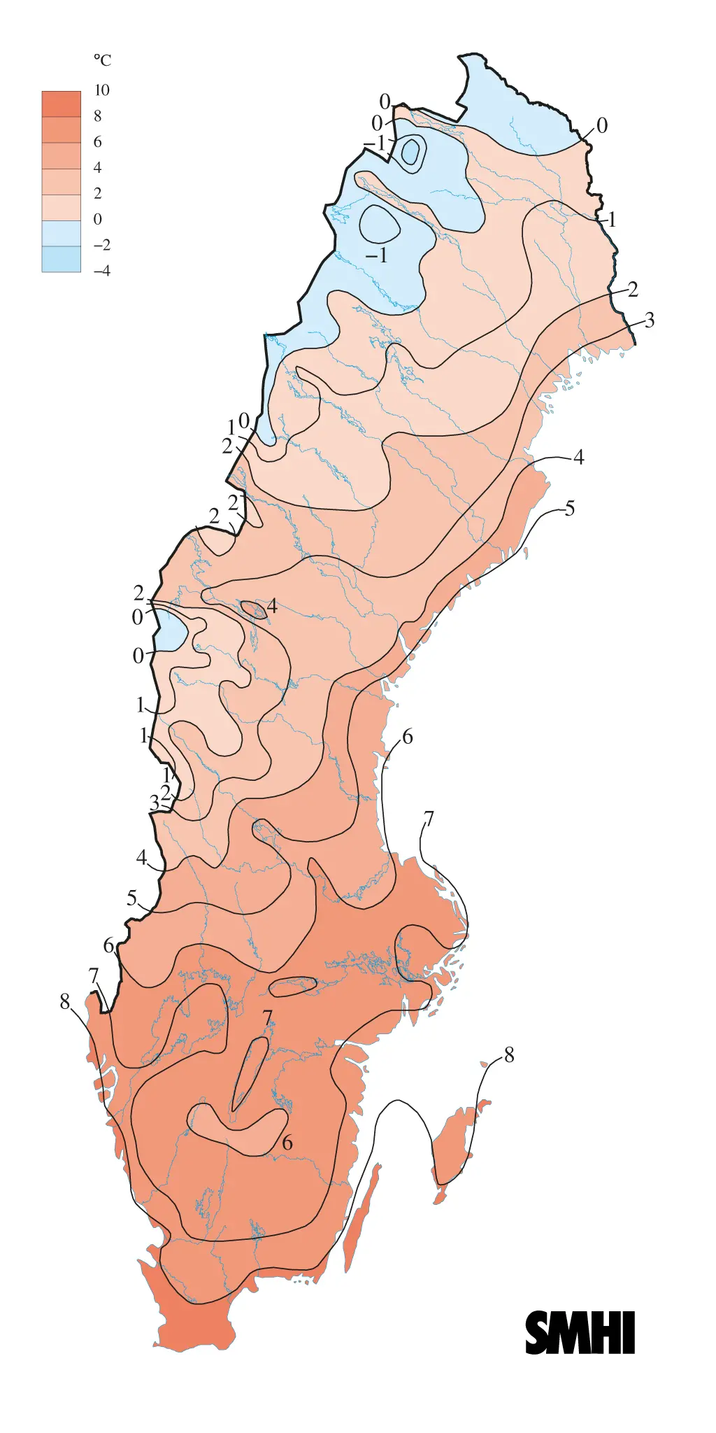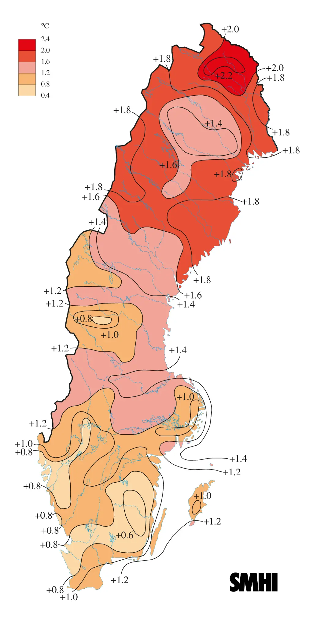 Hela Sverige hade en årsmedeltemperatur över normalvärdet för referensperioden 1961-1990. Som mest var temperaturöverskotten lite drygt två grader i nordöstra Norrland.