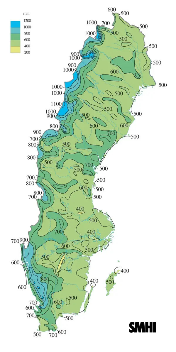 Den minsta årsnederbörden rapporterade Ölands norra udde med 323 mm.
