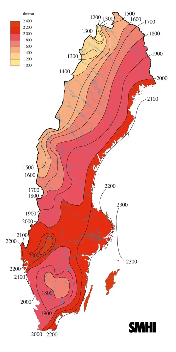 Flest soltimmar hade Svenska Högarna med 2315 timmar.