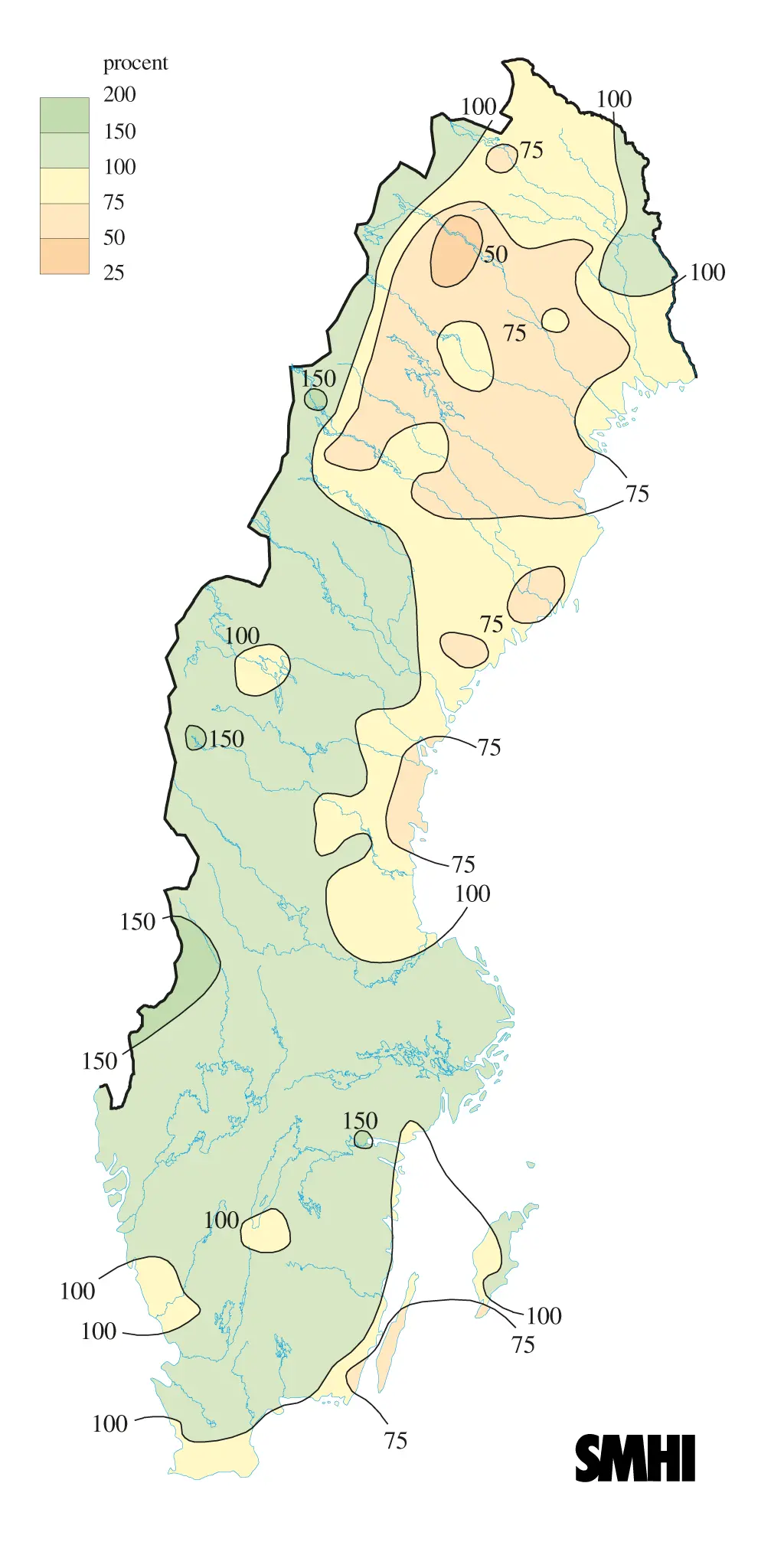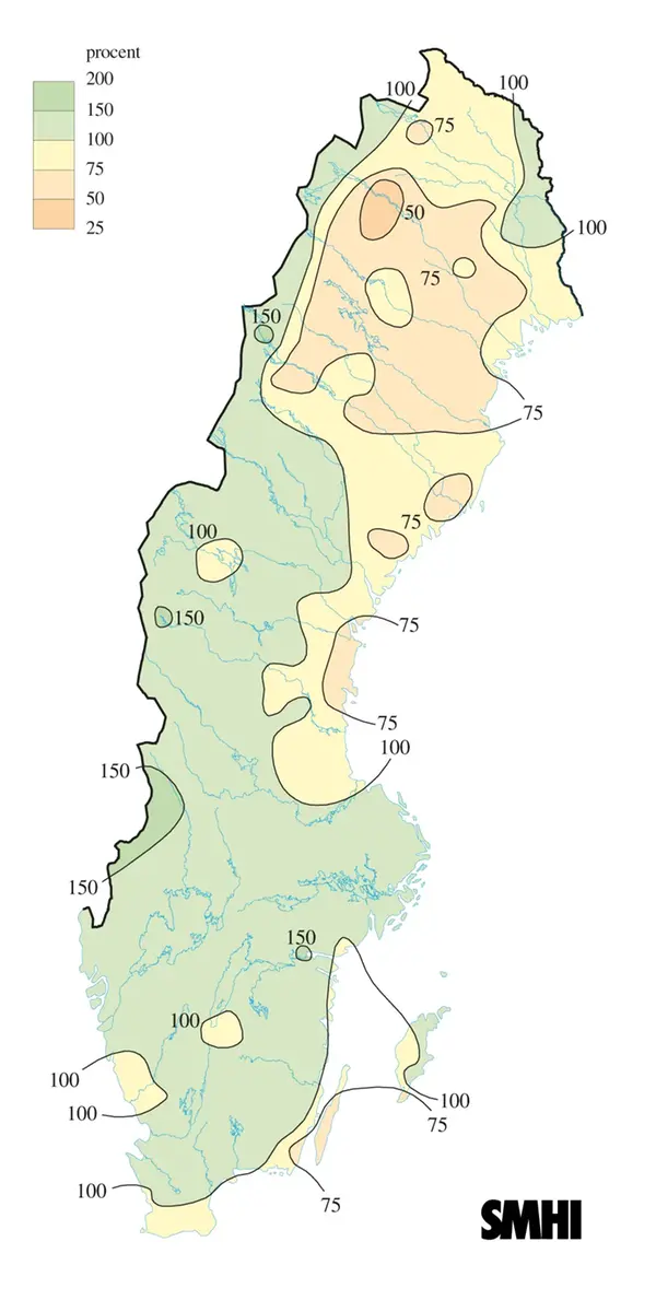 I södra och mellersta delen av Sverige föll i allmänhet mer nederbörd än normalt, medan det i norra Sverige kom lite mindre nederbörd än normalt.