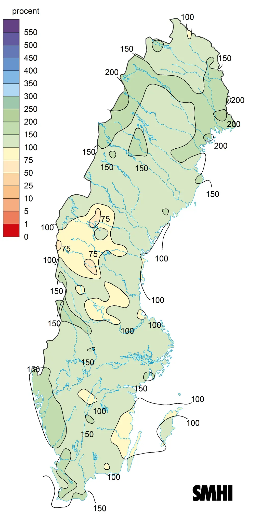 Mest nederbörd jämfört med normalt föll det i Norrbotten, delar av Lapplandsfjällen samt längs väst och sydkusten. I dessa områden föll det upp mot drygt dubbla normalmängden.