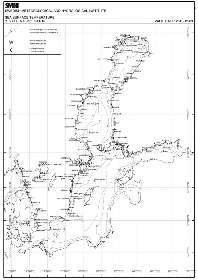 Ytvattentemperaturen har legat över nollan ända upp i Bottenviken så någon havsis har inte förekommit under hösten. Detta var fallet även hösten 2014.
