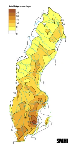 I de norra fjälltrakterna var det i allmänhet inte någon högsommardag (maximitemperatur >=25,0°) under sommaren 2016. I södra och östra Götaland var det däremot på många håll drygt 15 högsommardagar. Toppade gjorde Målilla med 27 stycken.