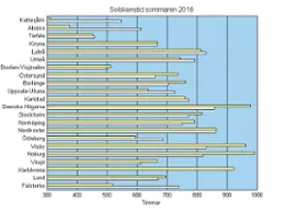 Förstora bildenAntal soltimmar under sommaren 2016 jämfört med det normala. Gul stapel=sommaren 2016, vit stapel=normalt. Normalvärden saknas för några stationer med kort mätserie.