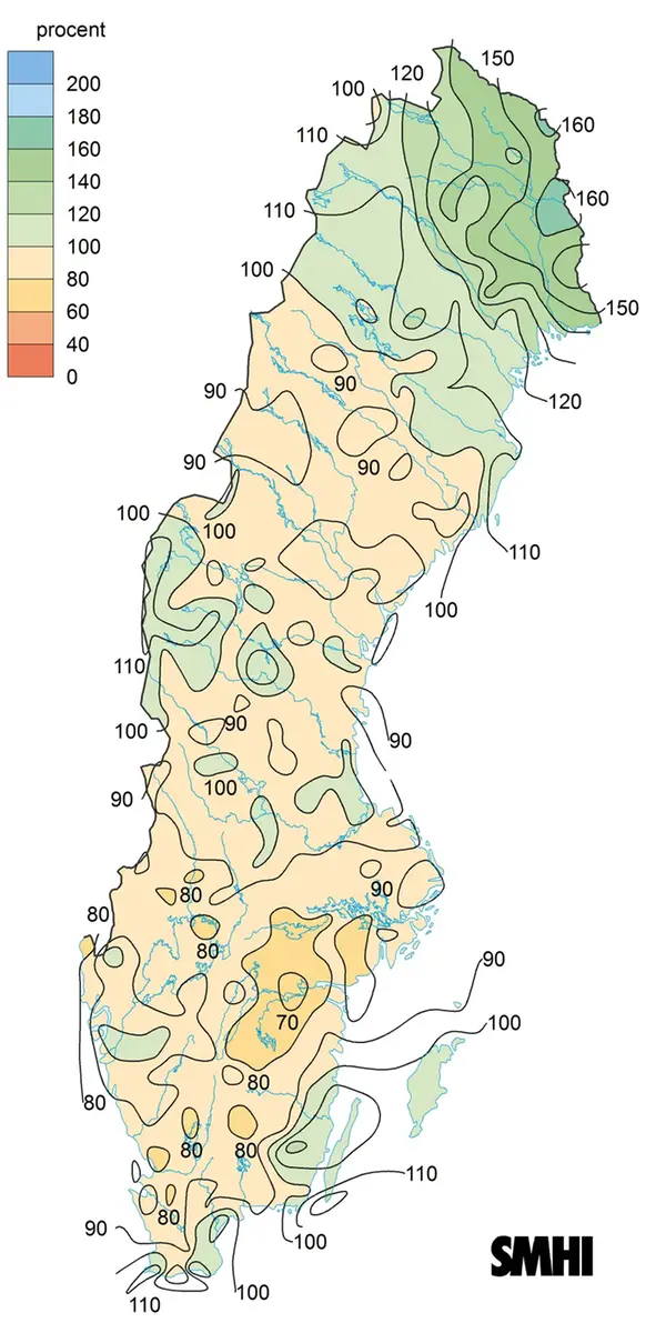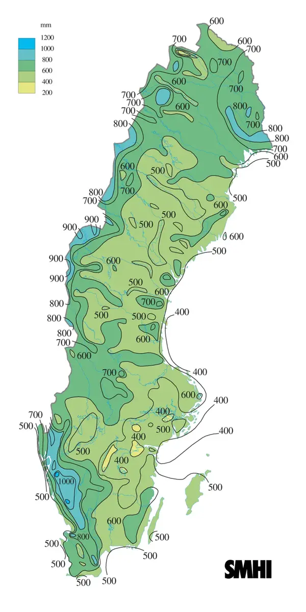 Den största årsnederbörden rapporterades från Mollsjönäs i Västergötland med 1 158 mm.