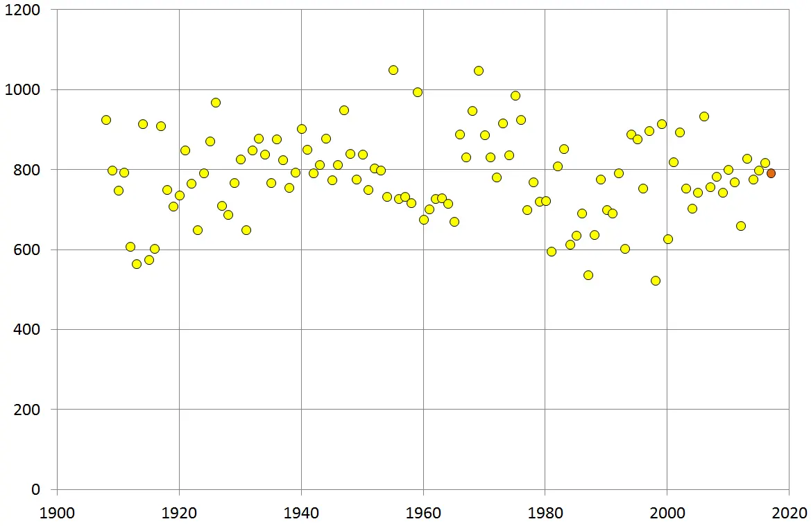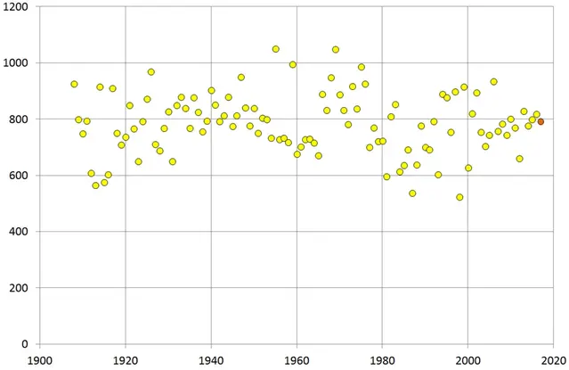 Förstora bildenSumma solskenstid juni, juli och augusti för Stockholm (timmar), med startår 1908. Observera att osäkerheten kan vara betydande för äldre data.