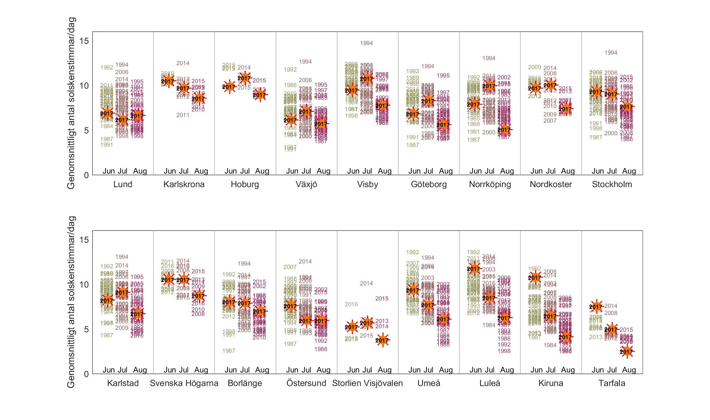Förstora bildenSolskenstid sommaren 2017 per månad (juni, juli och augusti) och station, orange stjärna. I bakgrunden syns motsvarande solskenstid för övriga år då stationen varit i drift, angivet med årtal. Enheten är genomsnittlig solskenstid per dag (timmar) under respektive månad.