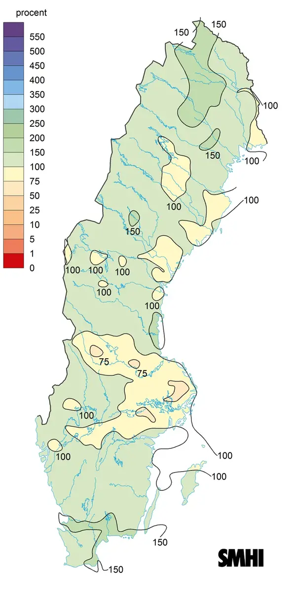Som framgår av kartan finns det ett ganska stort område som har fått mindre än 75% av normal sommarnederbörd i östra Svealand. Sommaren har dock inte varit extremt torr. Den i absoluta tal minsta sommarnederbörden rapporterades från Fårösund-Ar på norra Gotland med 92.3 mm..