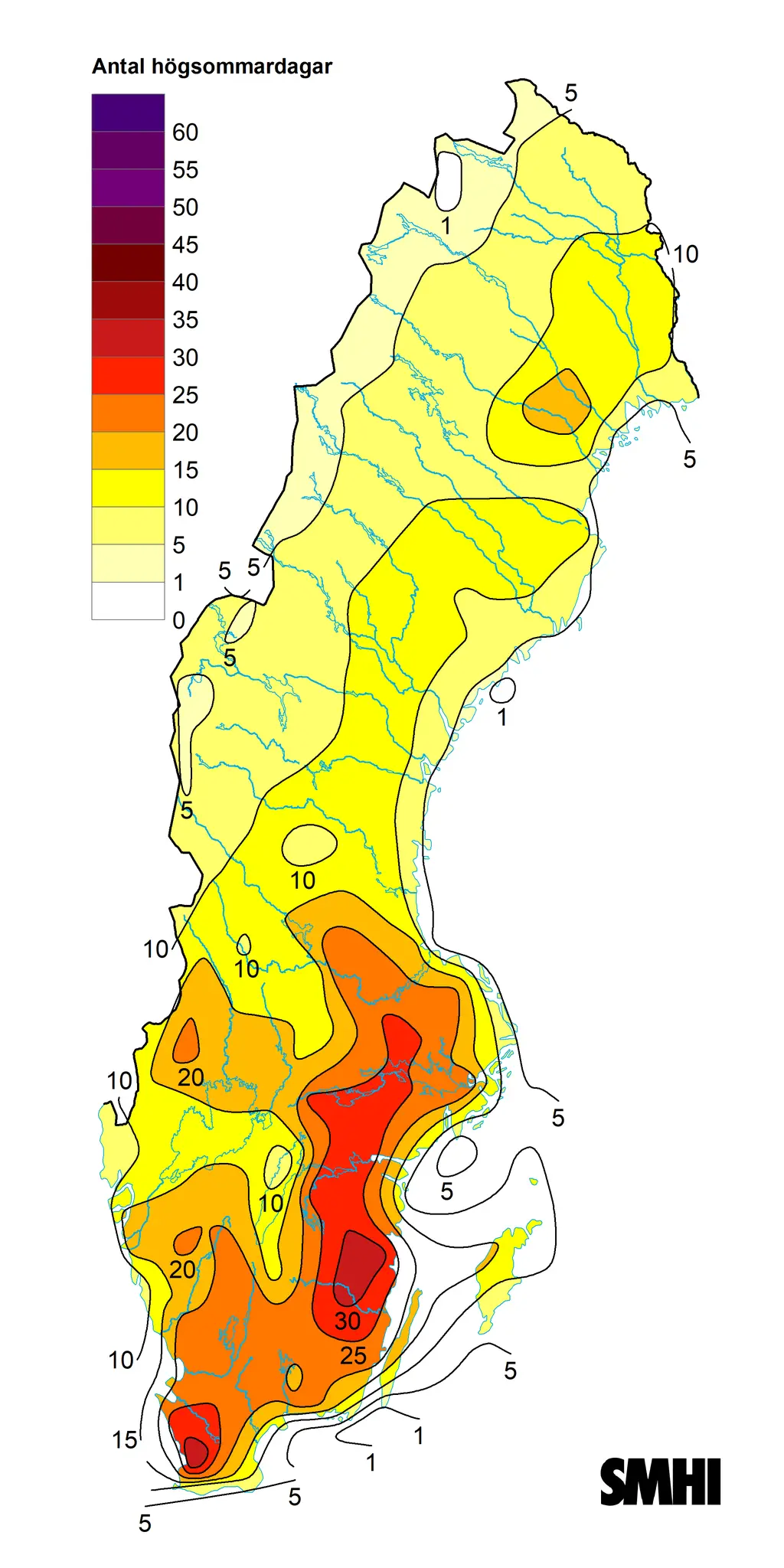 Flest antal högsommardagar fick Lund i Skåne med 38 stycken följt av Målilla i Småland som noterade 35 stycken. Även höghöjdsstationerna Blåhammaren (1090 möh), Sylarna (1030 möh) som båda ligger i Jämtland samt Stekenjokk (1036 möh) i södra Lappland noterade maximitemperatur på 25,0° eller högre vid minst ett tillfälle. Fyra stationer i landet noterade ingen högsommardag. Dessa var Tarfala (1150 möh) i Lapplandsfjällen samt kuststationerna Skagsudde i Ångermanland, Ölands södra udde och Utklippan i Blekinge skärgård.
