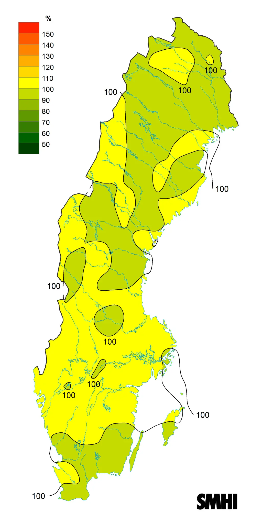 Hela Sverige fick temperaturöverskott även om de var små längs med norra Norrlandskusten och Tornedalen. De största temperaturöverskotten på omkring 2 grader från normalperioden 1961-1990 återfanns i södra Götaland.