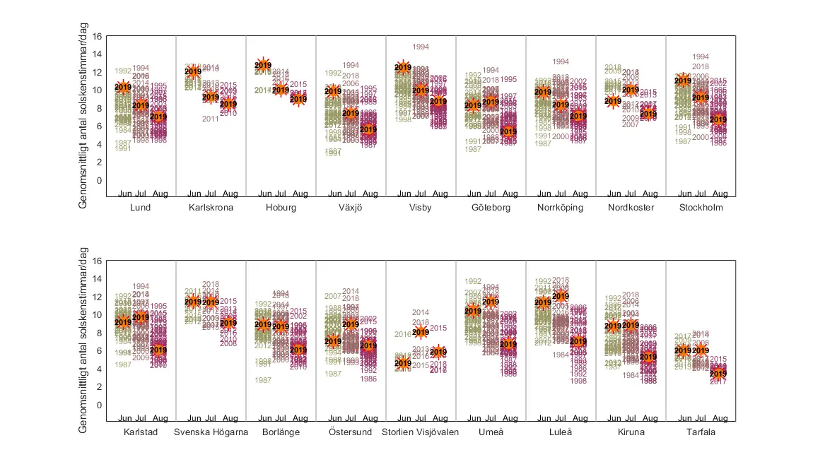 Förstora bildenSolskenstid sommaren 2019 per månad (juni, juli och augusti) och station, markerad med orange sol-symbol. I bakgrunden syns motsvarande solskenstid för övriga år då stationen varit i drift, angivet med årtal. Diagrammet omfattar endast perioden från 1983, även för stationer som startade tidigare. Enheten är genomsnittlig solskenstid per dag (timmar) under respektive månad.