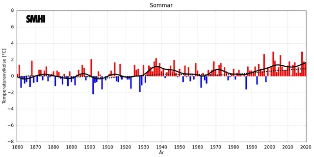 Jämfört med referensperioden 1860-1900 har det under 2000-talet varit en klar dominans av varma somrar. De tre senaste årens somrar tillhör alla toppskiktet. För att finna en svensk sommar som varit kyligare än referensperioden 1860-1900 får vi gå tillbaka till 1998.