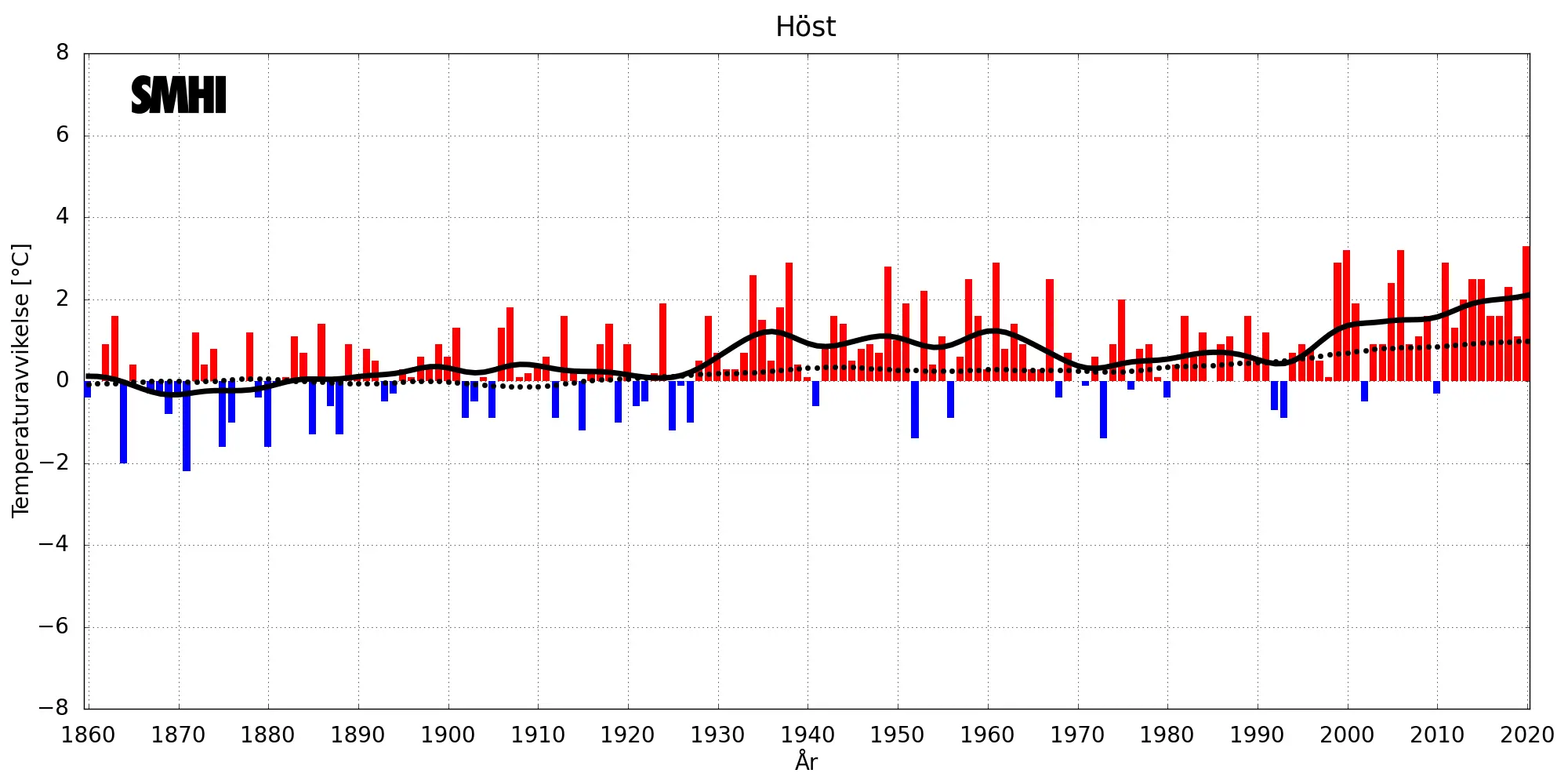 Förstora bildenStapeldiagrammet visar avvikelsen från ett referensvärde 1860-1900 för Sverigemedeltemperaturen under hösten (baserat på 35 stationer med mycket långa mätserier). Den svarta kurvan visar ett utjämnat förlopp ungefär motsvarande tio-åriga medelvärden. Linjen med prickar visar motsvarande utjämnade förlopp för den globala medeltemperaturen under hösten (data från CRU).