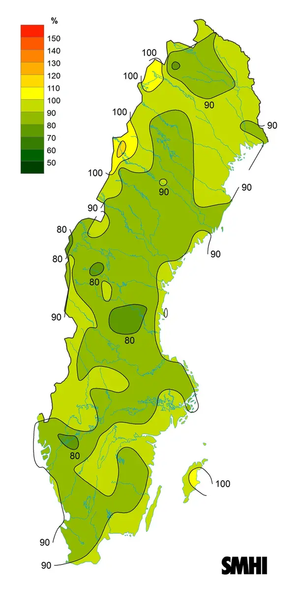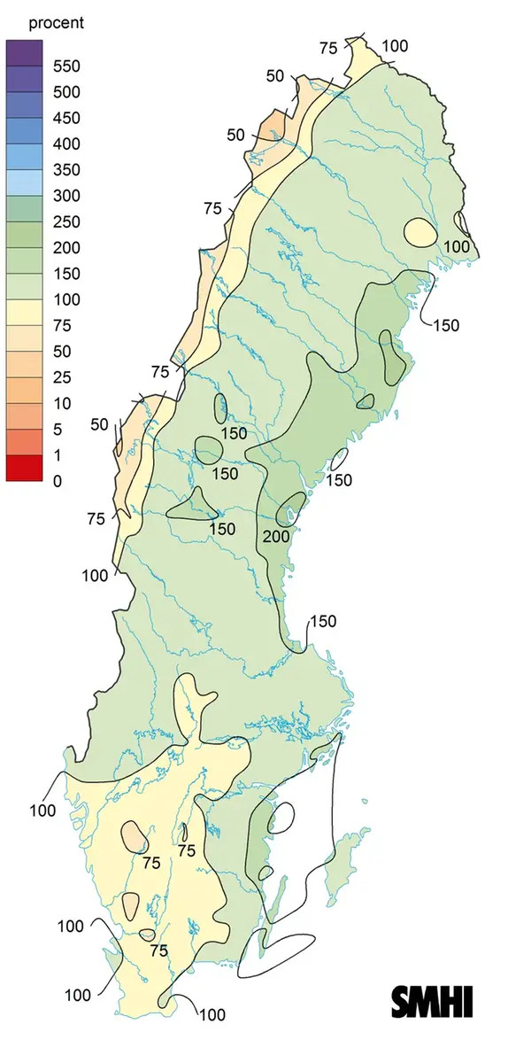 I fjällen var det däremot torrt med lokalt mindre än 50% av normal nederbörd. Länge såg det ut att kunna bli fråga om rekord i Riksgränsfjällen men nederbördsförande vindar från väster under de sista dygnen omintetgjorde detta.