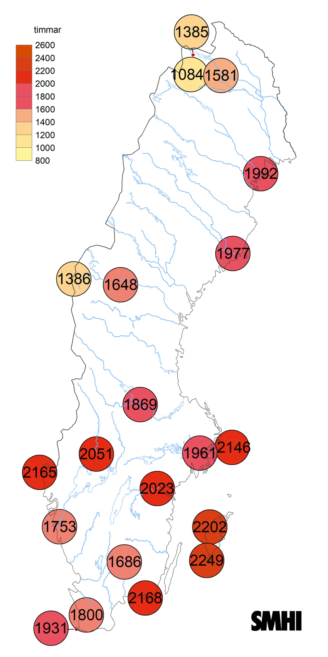 2021 var ett övervägande soligt år, men det blev inga rekordvärden. Flest soltimmar hade Hoburg med 2249 timmar.