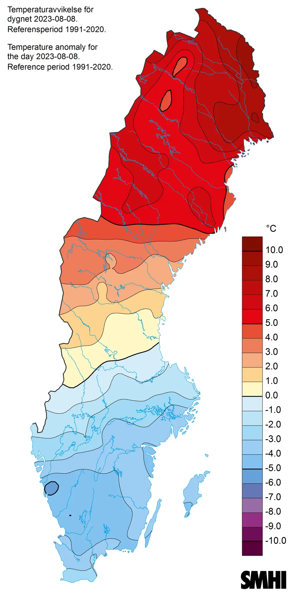 Men tittar man lite bakom denna statistik så ser man det som kanske är mer intressant: juni var flera grader varmare än normalperioden i stort sett i hela landet, och juli var kallare med undantag av norra fjällkedjan.