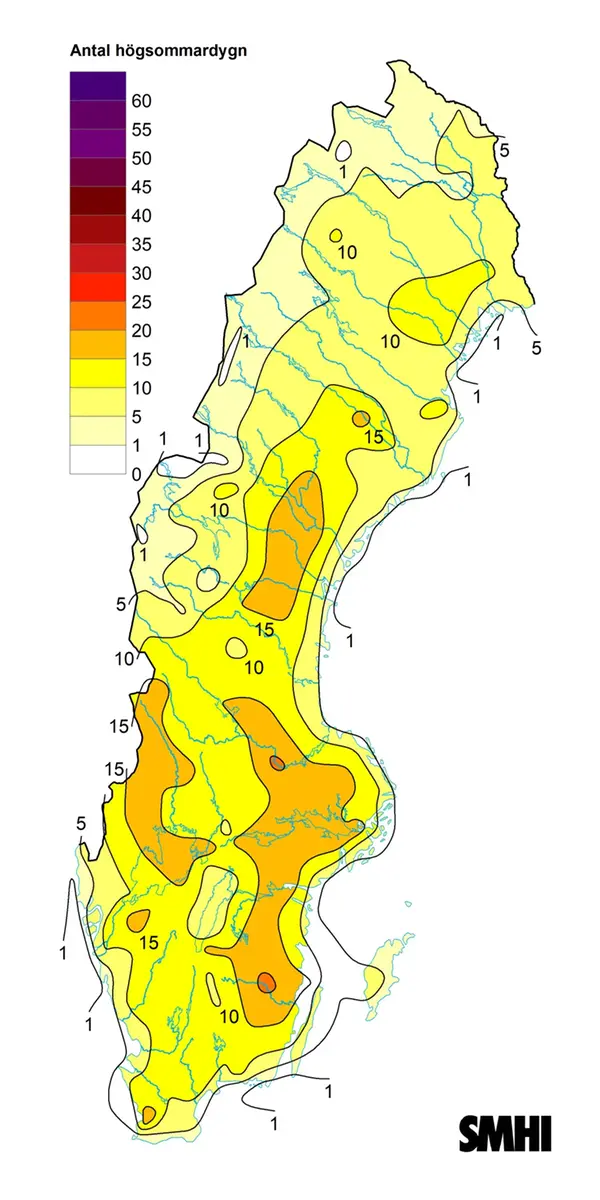 Antalet högsommardygn nådde knappt upp till 20 under sommaren. 20 dygn nåddes i sydöstra Sveriges inland och som jämförelse nådde båda de varma somrarna 2019 och 2020 runt 30 högsommardygn i ungefär motsvarande område. I nordöstra Sverige var antalet runt 10 vilket är liknade somrarna 2019 och 2020.