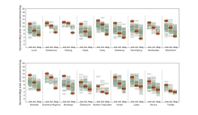 Förstora bildenSolskenstid sommaren 2023 per månad (juni, juli och augusti) och station, markerad med orange sol-symbol. I bakgrunden syns motsvarande solskenstid för övriga år då stationen varit i drift, angivet med årtal. Diagrammet omfattar endast perioden från 1983, även för stationer som startade tidigare. Enheten är genomsnittlig solskenstid per dag (timmar) under respektive månad.