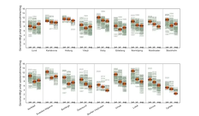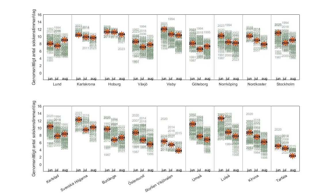 Förstora bildenSolskenstid sommaren 2024 per månad (juni, juli och augusti) och station, markerad med orange sol-symbol. I bakgrunden syns motsvarande solskenstid för övriga år då stationen varit i drift, angivet med årtal. Diagrammet omfattar endast perioden från 1983, även för stationer som startade tidigare. Enheten är genomsnittlig solskenstid per dag (timmar) under respektive månad.