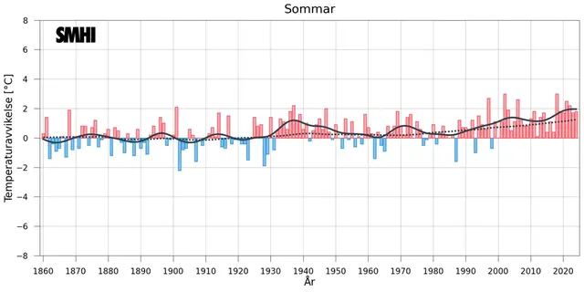 Förstora bildenStapeldiagrammet visar avvikelsen från ett referensvärde 1860-1900 för Sverigemedeltemperaturen under sommaren (baserat på 35 stationer med mycket långa mätserier). Den svarta kurvan visar ett utjämnat förlopp ungefär motsvarande tio-åriga medelvärden. Linjen med prickar visar motsvarande utjämnade förlopp för den globala medeltemperaturen under sommaren (data från CRU).