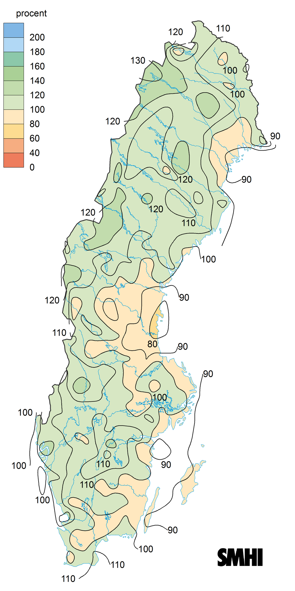 I större delen av Sverige föll mer nederbörd än normalt för referensperioden 1991-2020. De procentuellt största överskotten hade delar av nordvästra Norrland. I de östra landskapen var det däremot lite torrare än normalt på många håll.