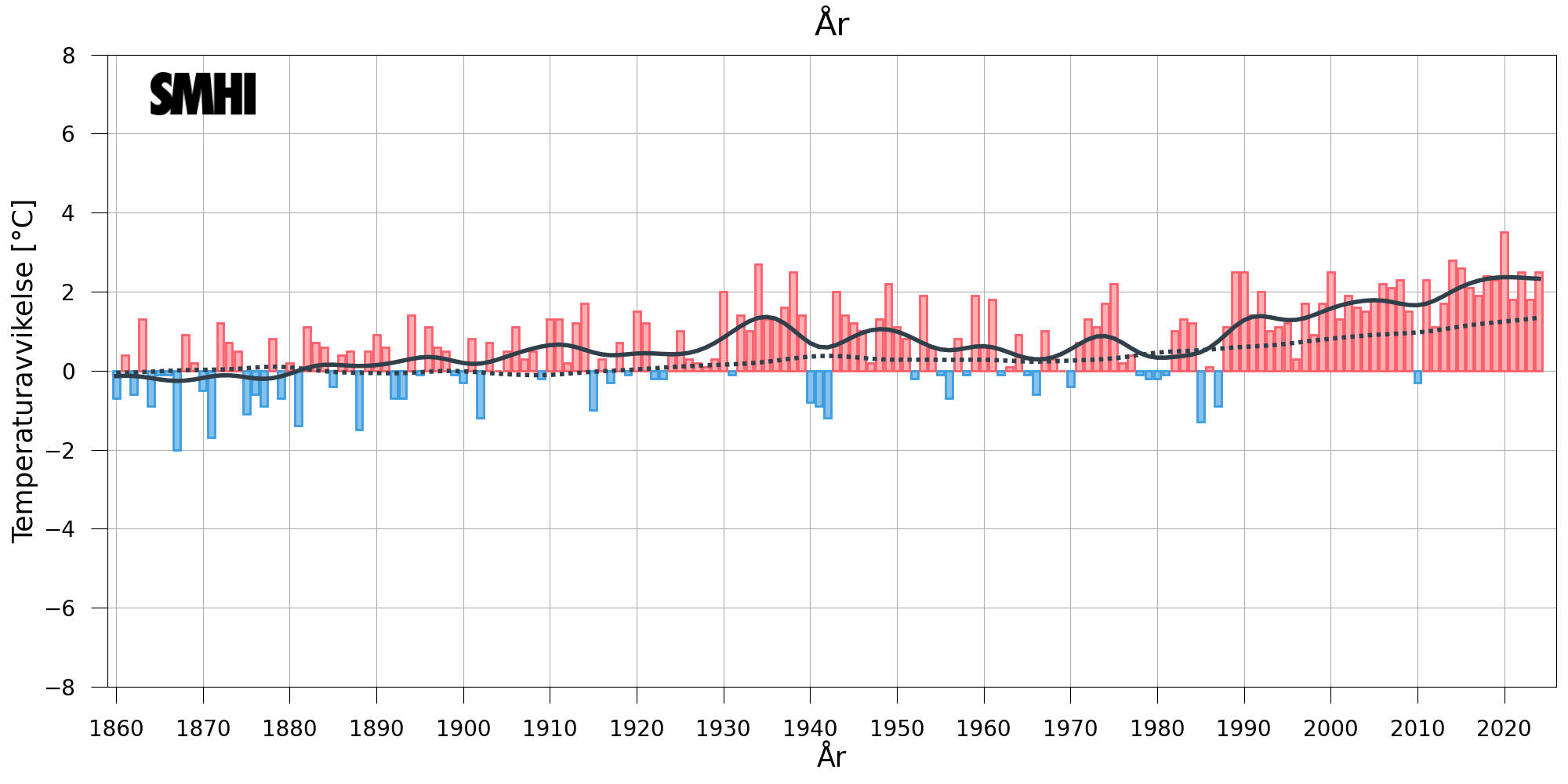 Förstora bildenStapeldiagrammet visar avvikelsen från ett referensvärde 1860-1900 för årsmedeltemperaturen i Sverige (baserat på 35 stationer med mycket långa mätserier). Den svarta kurvan visar ett utjämnat förlopp ungefär motsvarande tio-åriga medelvärden. Linjen med prickar visar motsvarande utjämnade förlopp för den globala årsmedeltemperaturen (data från CRU).