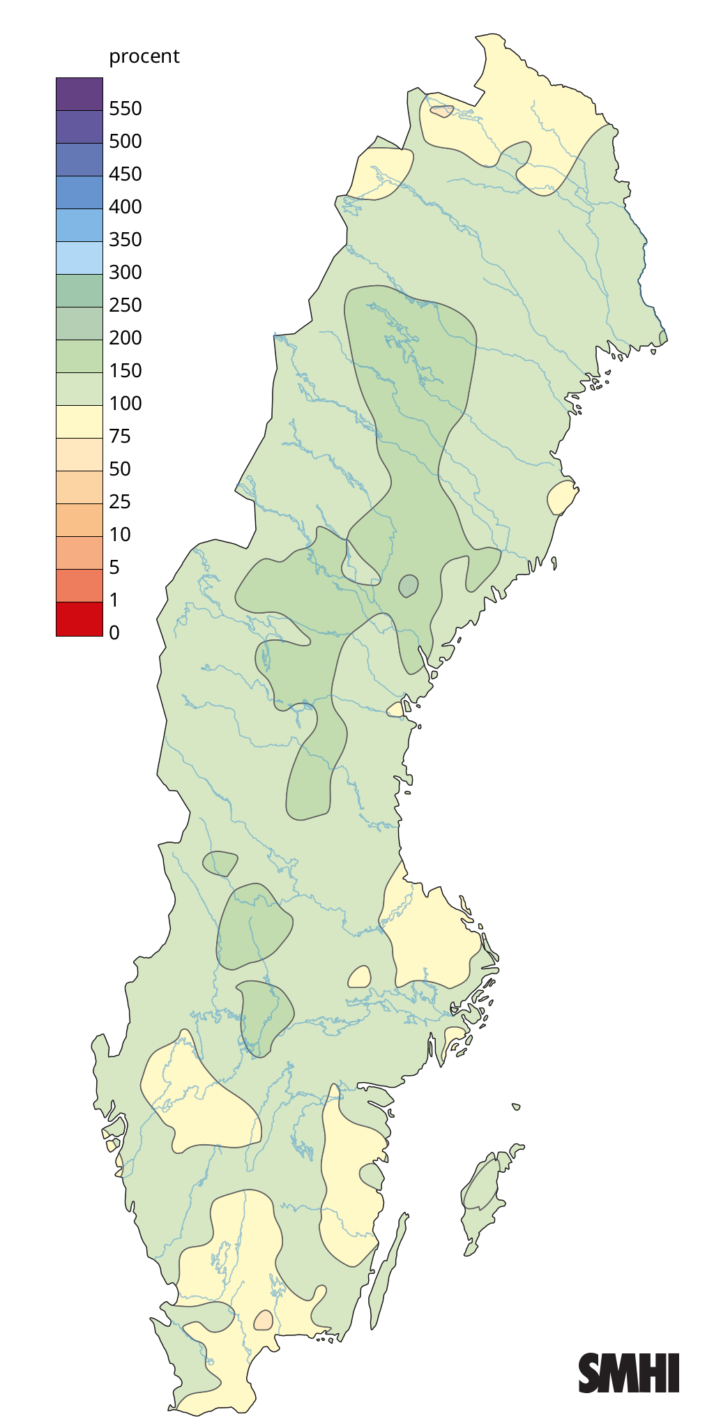 Sammantaget var det en blöt eller mycket blöt månad på de flesta håll i landet. Endast i Riksgränsfjällen och delar av Jämtlandsfjällen föll det avgjort mindre nederbörd än normalt.