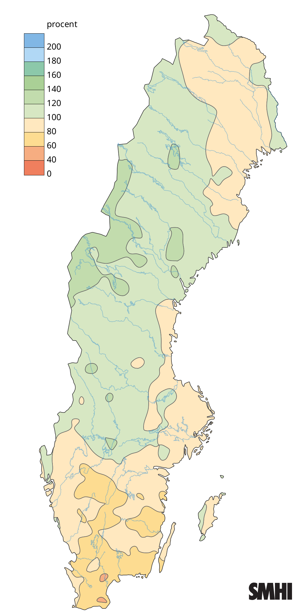 Nästan hela västra Svealand samt mellersta och västra Norrland fick däremot mer nederbörd än normalt med de största överskotten i Jämtland. Både Multrå (startår 1881) i Ångermanland och Arjeplog (startår 1946) i Lappland hade sitt tredje nederbördsrikaste år.