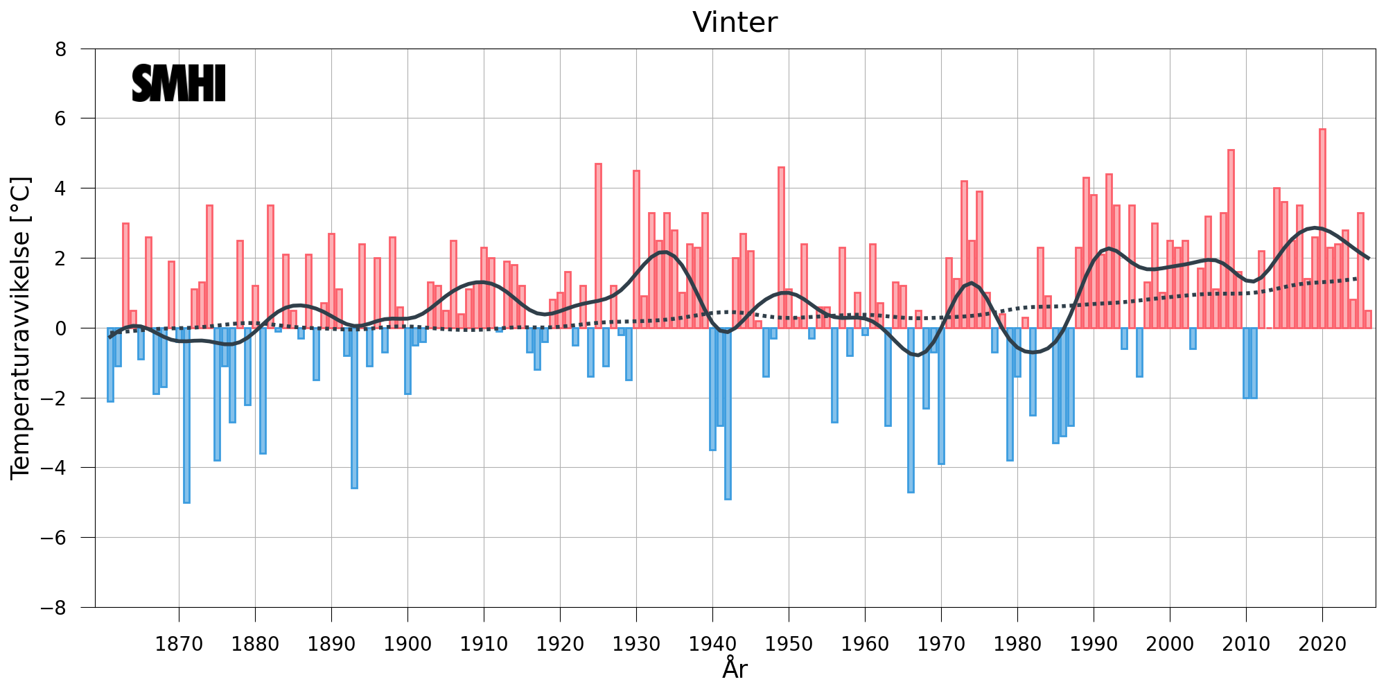 Förstora bildenStapeldiagrammet visar avvikelsen från ett referensvärde 1860-1900 för Sverigemedeltemperaturen under vintern (baserat på 35 stationer med mycket långa mätserier). Den svarta kurvan visar ett utjämnat förlopp ungefär motsvarande tio-åriga medelvärden. Linjen med prickar visar motsvarande utjämnade förlopp för den globala medeltemperaturen under vintern (data från CRU).