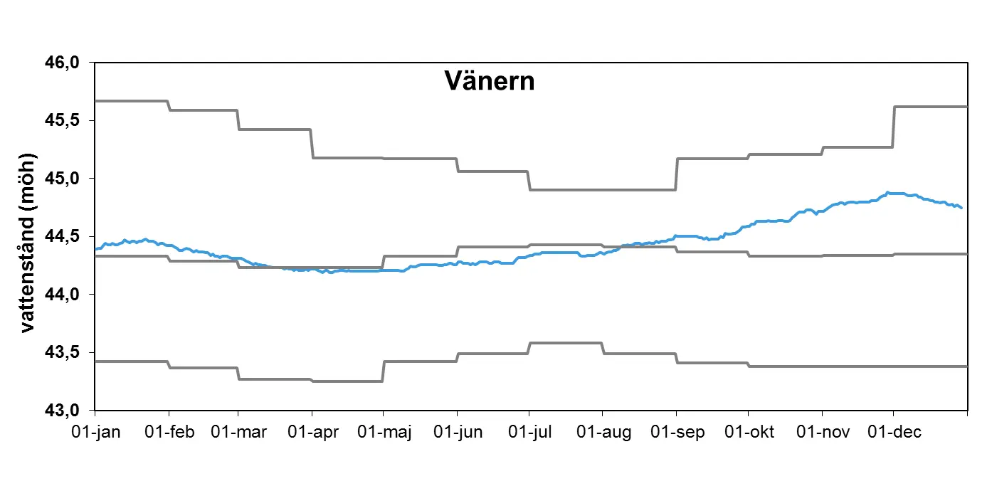 2012 var ett nederbördsrikt år och det avspeglas också i de stora sjöarnas vattennivåer. Sjöarna har inte någon gång under året haft låga nivåer. Däremot har vattenståndet i Vänern, Vättern och Mälaren periodvis varit höga.