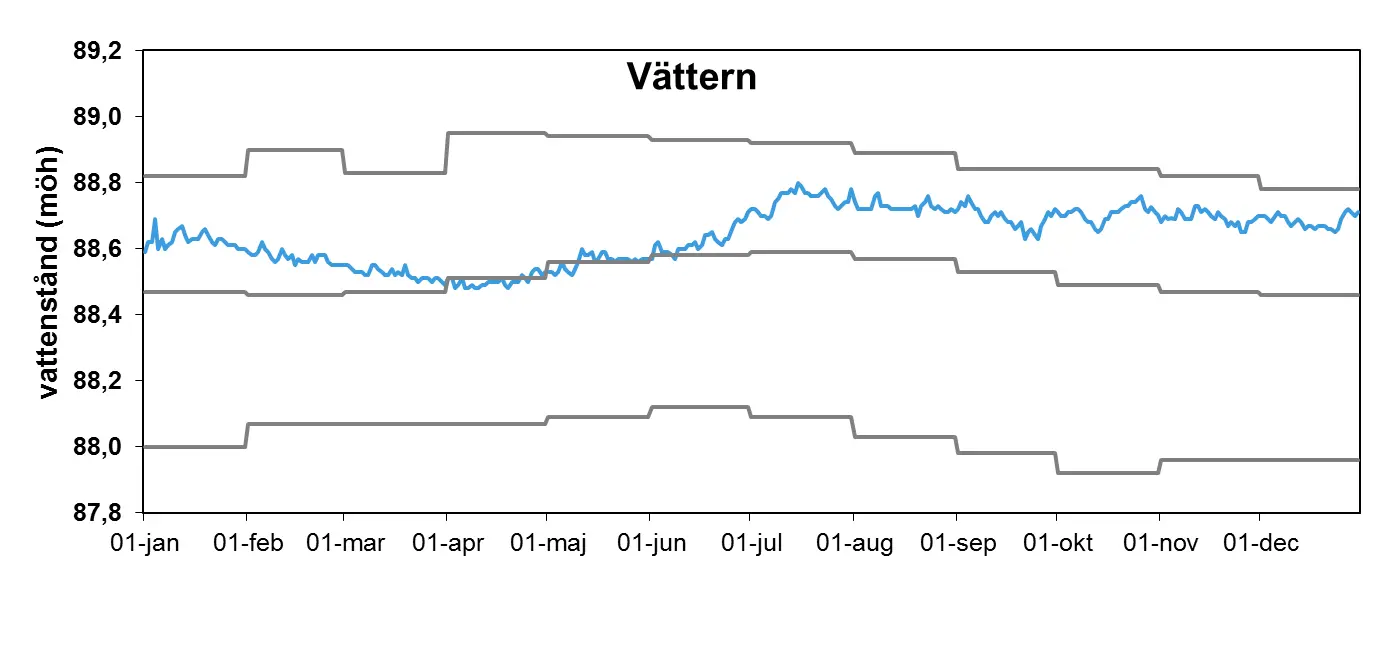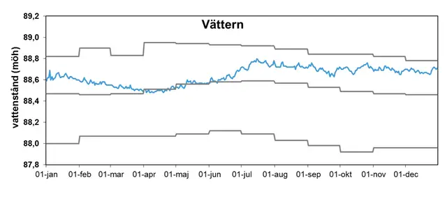 Förstora bildenDen blå linjen visar vattenståndet i Vättern 2012. De grå linjerna representerar de högsta och lägsta uppmätta månadsvärdena samt månadsmedelvärde för perioden 1959-2010. Alla nivåer anges i meter över havet i höjdsystemet RH00. Data har samlats in av Tekniska verken i Linköping.
