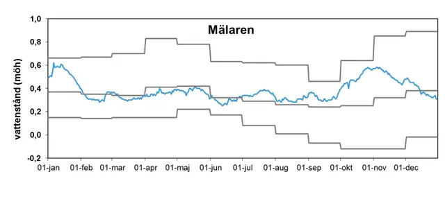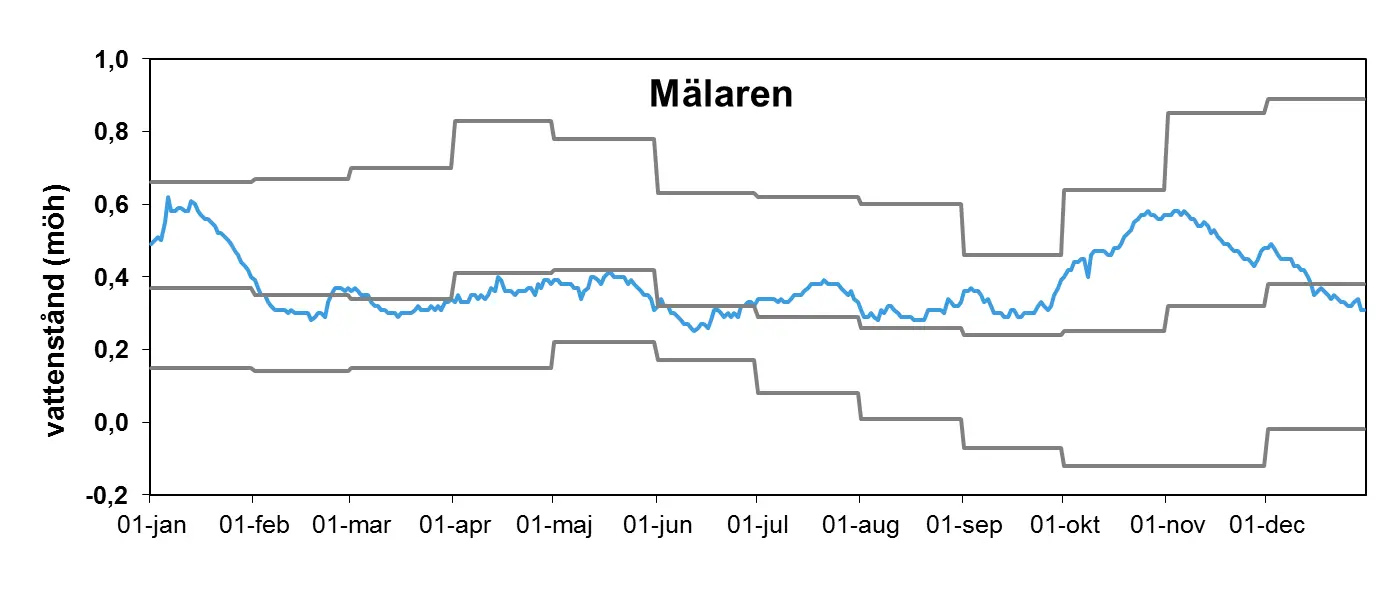 Förstora bildenDen blå linjen visar vattenståndet i Mälaren 2012. De grå linjerna representerar de högsta och lägsta uppmätta månadsvärdena samt månadsmedelvärde för perioden 1968-2010. Alla nivåer anges i meter över havet i höjdsystemet RH00. Data har samlats in av Stockholms hamn AB.