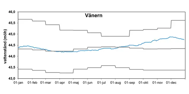 Förstora bildenDen blå linjen visar vattenståndet i Vänern 2012. De grå linjerna representerar de högsta och lägsta uppmätta månadsvärdena samt månadsmedelvärde för perioden 1939-2010. Alla nivåer anges i meter över havet i höjdsystemet RH00. Data har samlats in av Vattenfall.