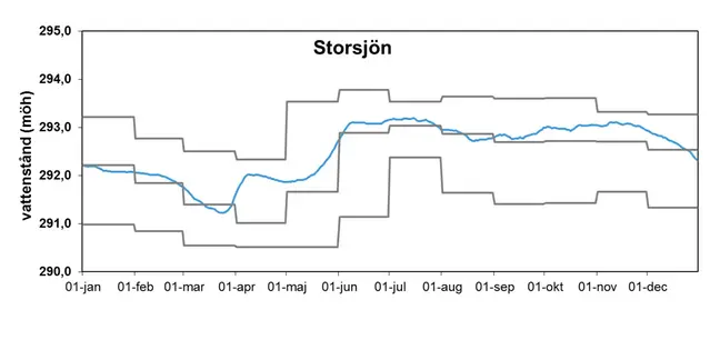 Förstora bildenDen blå linjen visar vattenståndet i Storsjön 2012. De grå linjerna representerar de högsta och lägsta uppmätta månadsvärdena samt månadsmedelvärde för perioden 1940-2010. Alla nivåer anges i meter över havet i höjdsystemet RH00. Data har samlats in av Vattenregleringsföretagen i Östersund.