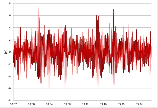 Förstora bildenBilden visar varje enskild våg från bojen vid Väderöarna under en 30-minutersperiod den 4 januari. Vågorna visas i meter från medelvattennivån. Från dessa vågor beräknas sedan den signifikanta våghöjden.