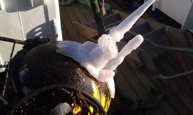 En nedisad vågboj. Under isen sitter antenner som den använder för att kommunicera via satellit.