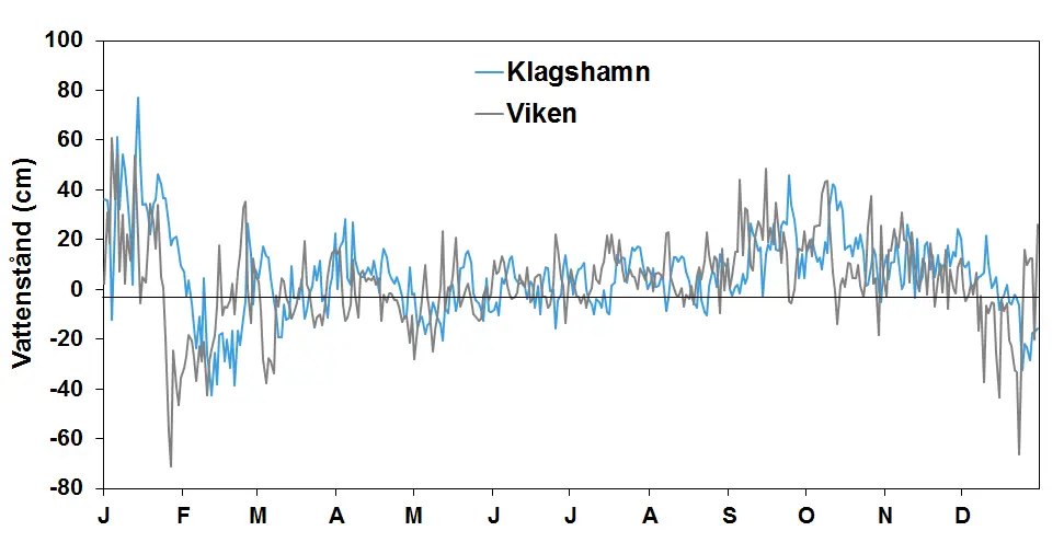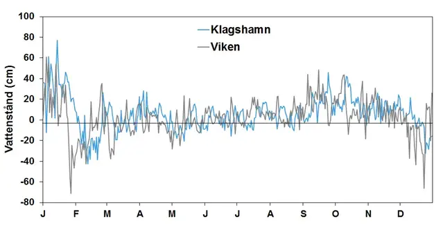 Förstora bildenHavsvattenståndet i Viken och Klagshamn. För Öresund beskrivs vattenståndet (cm) i dess norra del av Viken och i dess södra del av Klagshamn. I diagrammet kan man se tillfällen då nivån i Viken är högre än i Klagshamn, dvs då det förekommer inflöde av saltvatten.