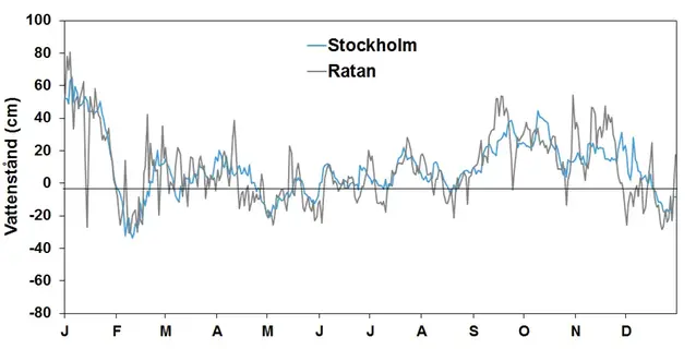 Förstora bildenStationerna Ratan och Stockholm representerar här vattenståndet (cm) i Östersjön.