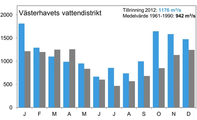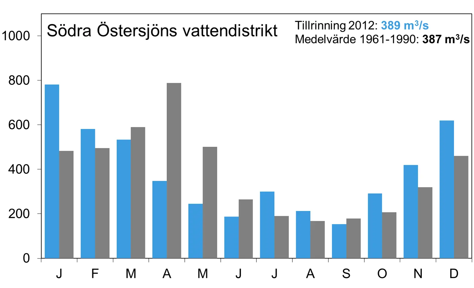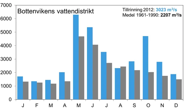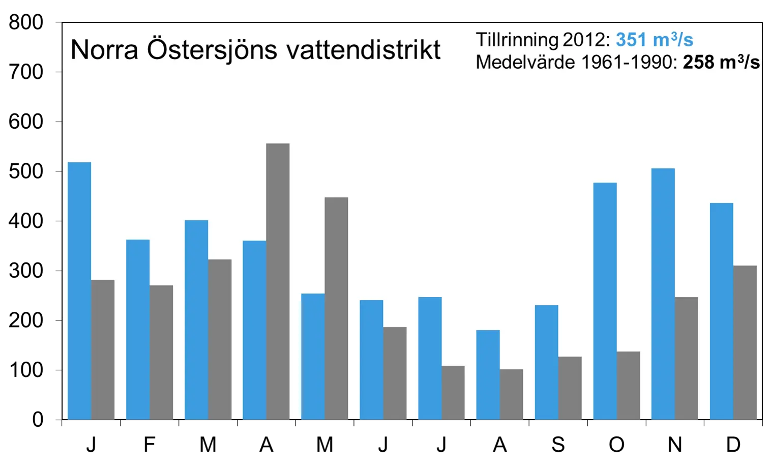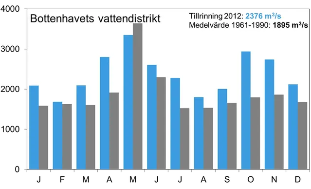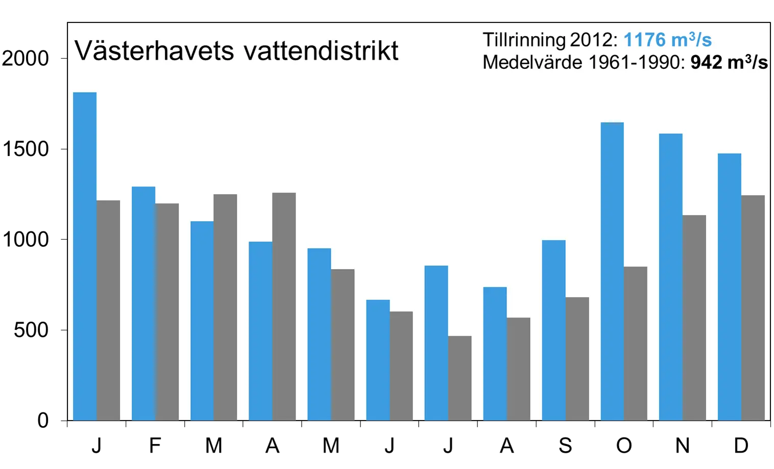 Den blå stapeln i graferna nedan visar tillrinningen 2012, den grå visar medelvärdet för normalperioden 1961-1990.