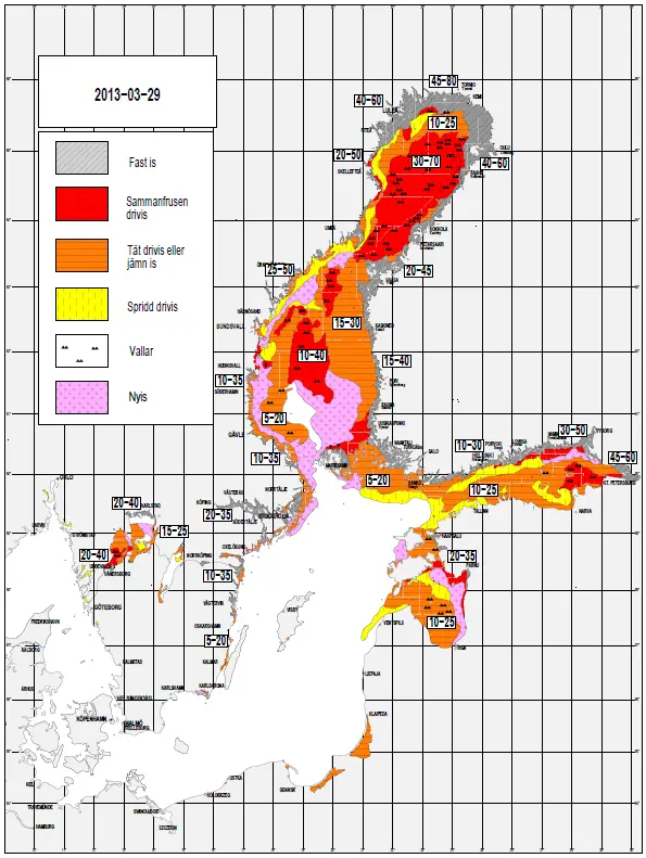 Förstora bildenMaximal isutbredning vintern 2012-2013 inträffade 29 mars. Siffrorna anger istjockleken i cm.