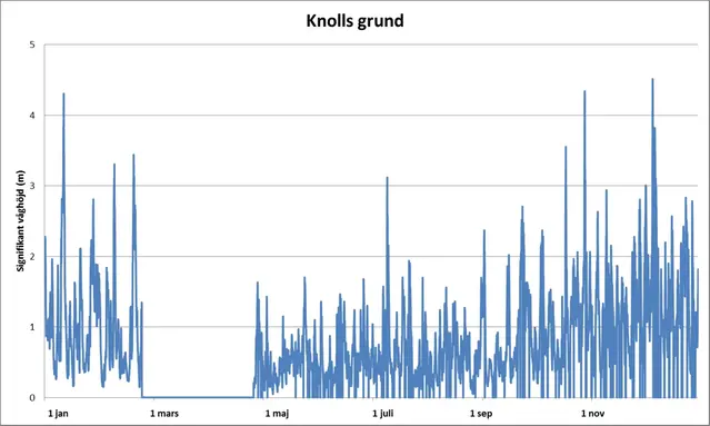 Förstora bildenDen signifikanta våghöjden uppmätt av bojen vid Knolls grund 2013. Bojen var upptagen under februari till april.