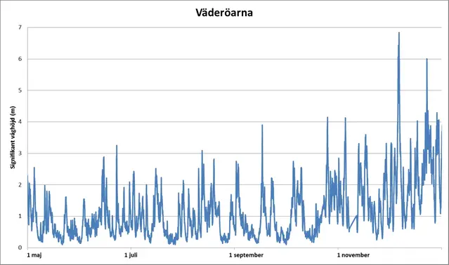 Eftersom vågbojarna togs in för servicearbete och för att inte skadas av eventuell is finns inga mätningar för delar av vintern och våren. Däremot finns beräknade våghöjder och dessa visar att i samband med en lågtryckspassage den 30 januari så steg den signifikanta våghöjden till ca 5 meter vid Väderöarna.