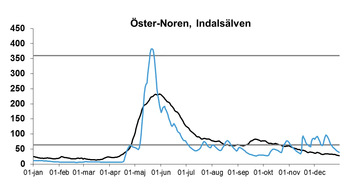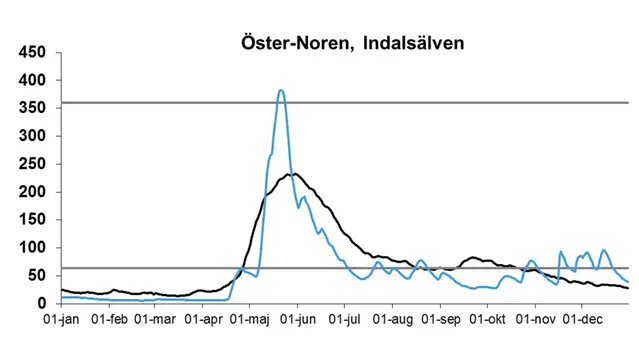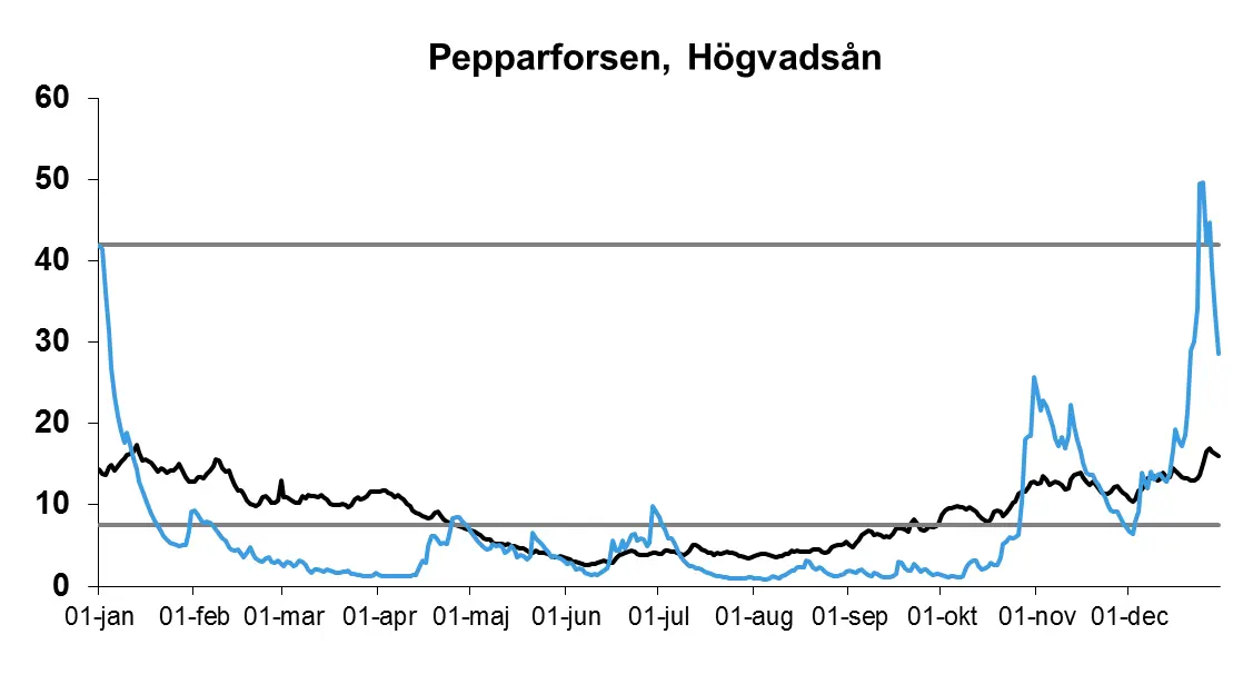 Förstora bildenVattenföringen i m³/s vid den hydrologiska mätstationen Pepparforsen. Den blå linjen visar dygnsvattenföringen för år 2013 och den svarta linjen anger medelvattenföringen dygnsvis för perioden 1985-2012. De gråa linjerna markerar medelhögvattenföringen (MHQ) dvs. medelvärdet av varje års högsta vattenföring respektive medelvattenföringen (MQ).
