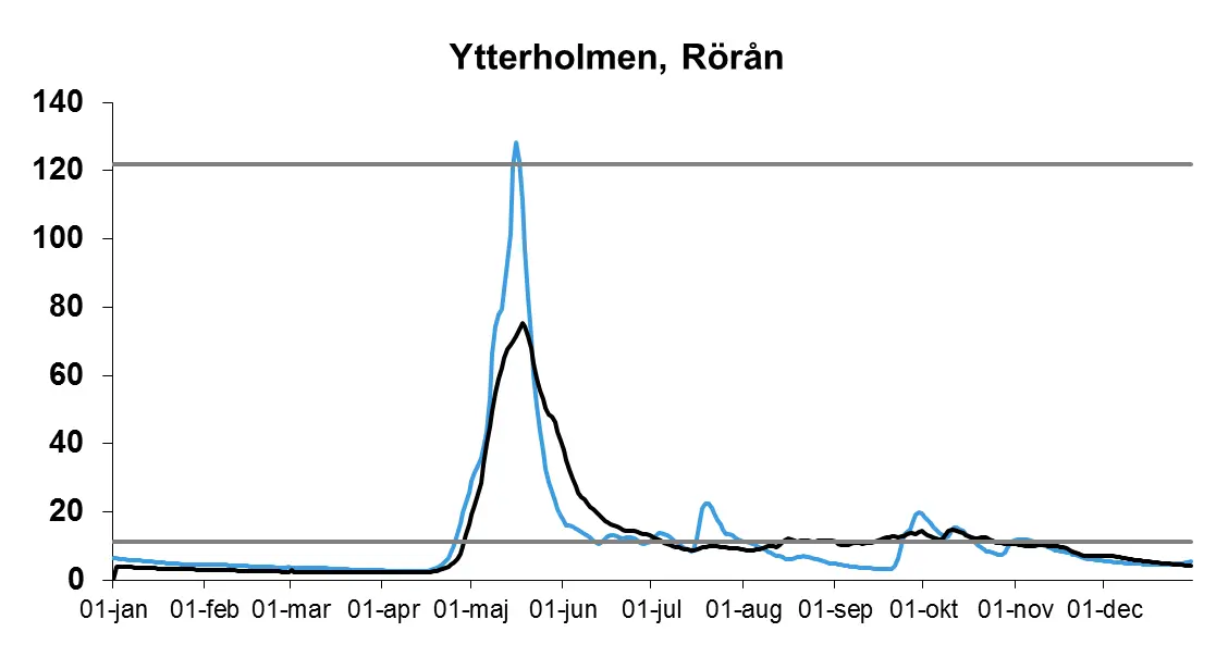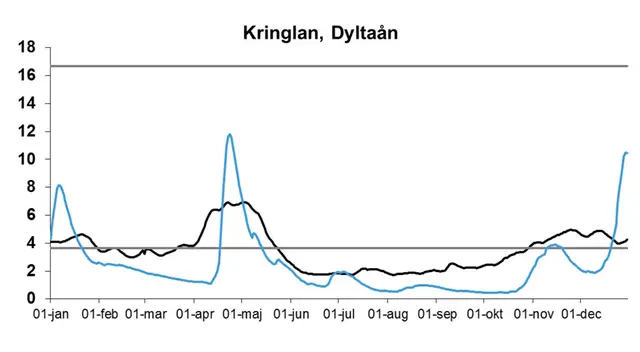 Förstora bildenVattenföringen i m³/s vid den hydrologiska mätstationen Kringlan. Den blå linjen visar dygnsvattenföringen för år 2013 och den svarta linjen anger medelvattenföringen dygnsvis för perioden 1985-2012. De gråa linjerna markerar medelhögvattenföringen (MHQ) dvs. medelvärdet av varje års högsta vattenföring respektive medelvattenföringen (MQ).