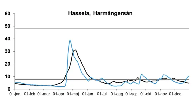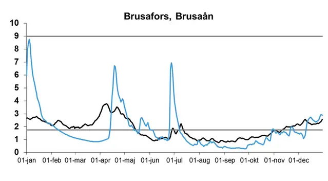 Förstora bildenVattenföringen i m³/s vid den hydrologiska mätstationen Brusafors. Den blå linjen visar dygnsvattenföringen för år 2013 och den svarta linjen anger medelvattenföringen dygnsvis för perioden 1985-2012. De gråa linjerna markerar medelhögvattenföringen (MHQ) dvs. medelvärdet av varje års högsta vattenföring respektive medelvattenföringen (MQ).