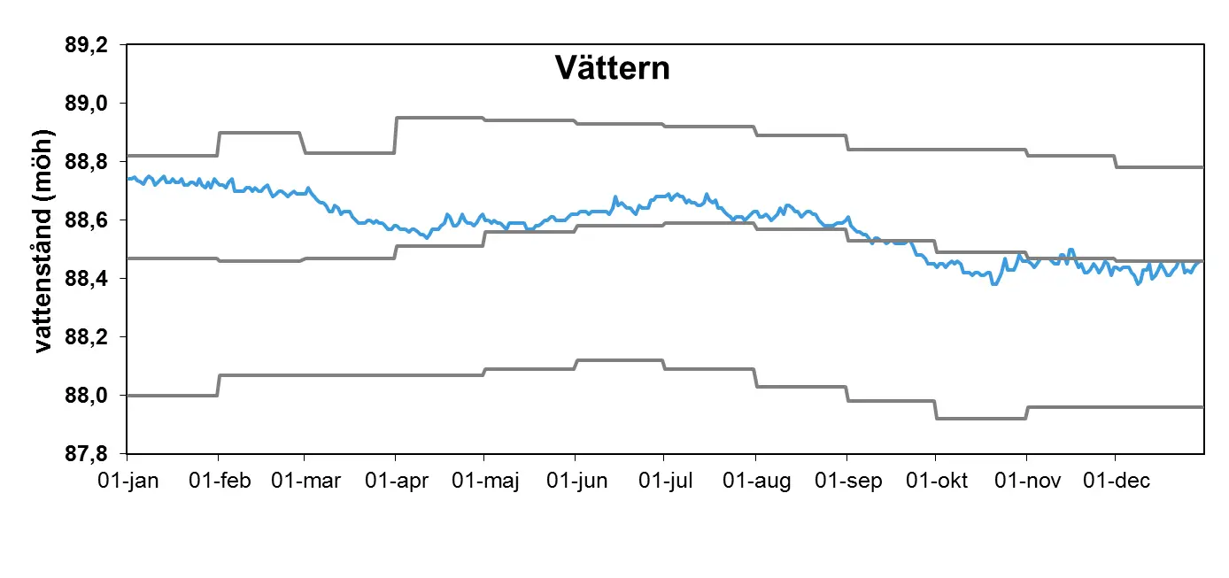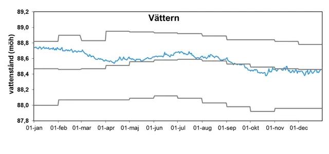 Även nivån i Vättern var i början av året över den normala. Nivån var i januari ca 30 cm högre än medelvärdet. Från april och resten av året var vattennivån nära den normala.