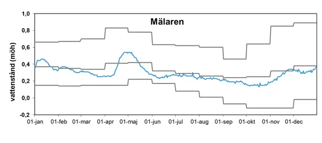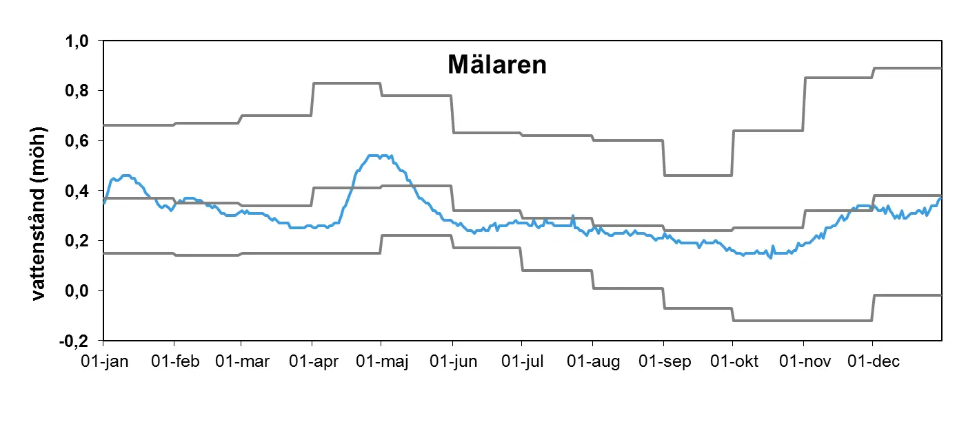 Under årets första månader var nivån i Mälaren nära den normala. I samband med snösmältning i april steg nivån och var som mest 0,5 m över havet. Vattennivån sjönk sedan snabbt och var under årets andra hälft lägre än medelvärdet. Som lägst var den i oktober, då den var drygt en dm lägre än normalt, vilket är den lägsta nivån som har uppmätts sedan 2002.